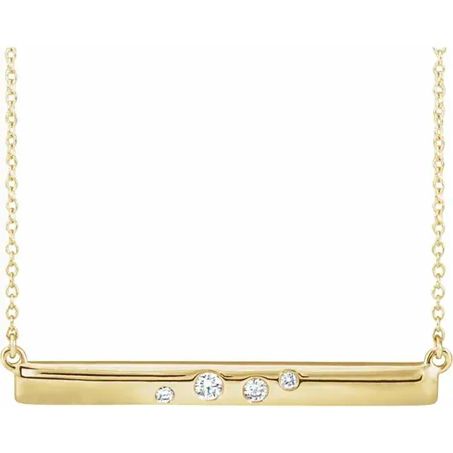 The .05 CTW Natural Diamond Bar 18″ Necklace is a refined and contemporary piece that effortlessly combines minimalist design with timeless elegance. Expertly crafted, this necklace features a slender bar pendant adorned with a total of 0.05 carats of dazzling natural diamonds, adding a subtle and captivating sparkle to your neckline. The option to choose between Yellow and White Gold allows for personalized styling, with Yellow Gold providing a classic warmth and traditional elegance, and White Gold offering a sleek and modern aesthetic. The delicate and streamlined design of the bar pendant makes it a versatile accessory suitable for both casual and formal occasions. With a secure lobster clasp closure, this Natural Diamond Bar Necklace is a sophisticated addition to your jewelry collection, enhancing your style with a touch of understated brilliance.