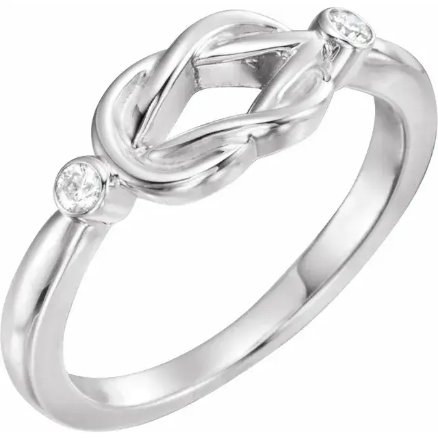 The 14K White Gold .06 CTW Natural Diamond Knot Ring is a mesmerizing symbol of eternal love and enduring style. Crafted in luminous 14K white gold, this exquisite ring features a delicately intertwined knot design adorned with .06 carats of natural diamonds. The diamonds are meticulously set to enhance the brilliance and sparkle within the intricate pattern, creating a captivating visual display. The white gold setting adds a touch of modern sophistication and versatility to the piece, making it suitable for various occasions. This diamond knot ring is a timeless and elegant accessory, perfect for expressing meaningful connections or as a chic addition to your everyday jewelry collection. Its graceful design and subtle shimmer make it a cherished piece for those who appreciate both classic charm and contemporary allure in their jewelry.