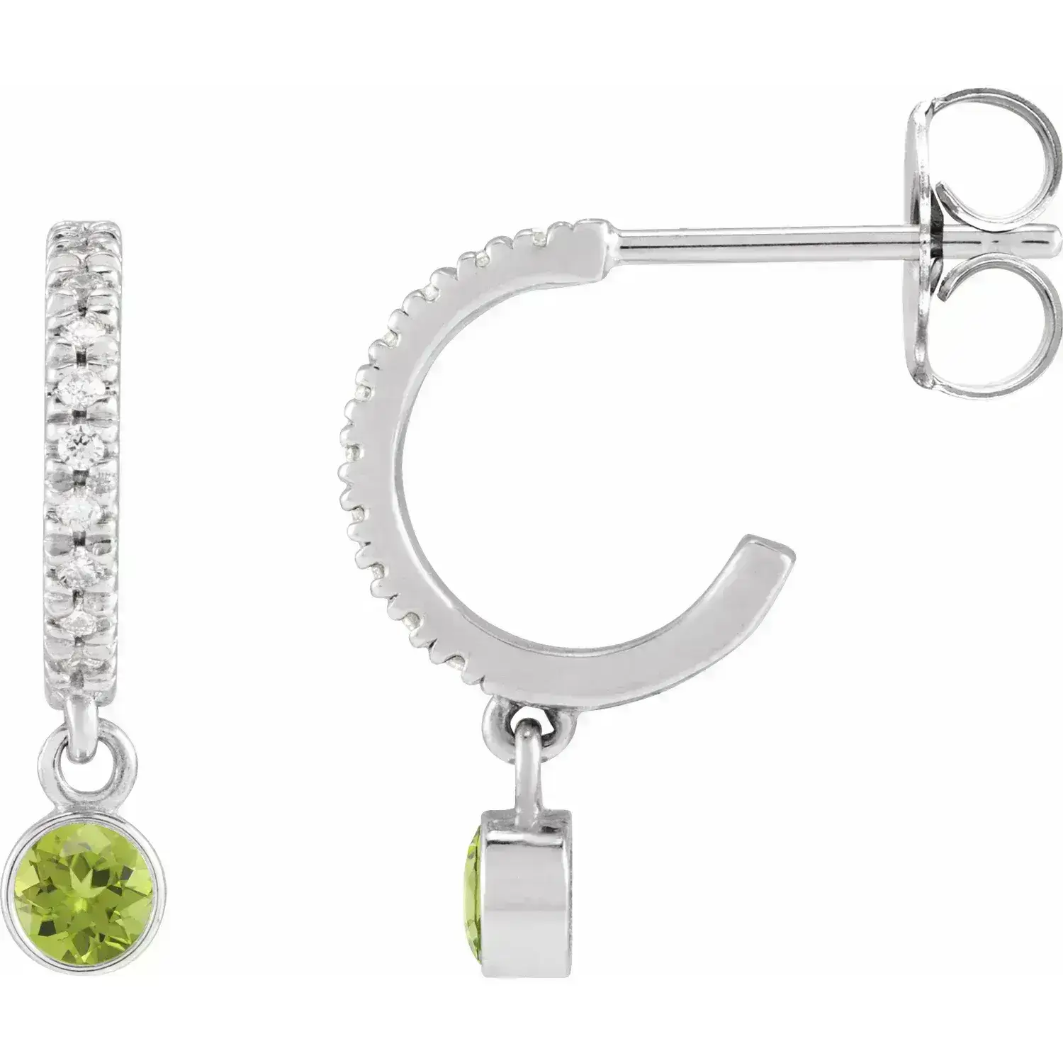 These earrings combine natural peridot, bright white gold, and clean hoop design. They bring refreshing color, smooth shine, and timeless elegance to any jewelry collection.